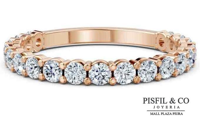 Diseño: Anillo de tipo «Eternity» o churumbela que destaca por un engaste de garras compartidas. Esta técnica minimiza la visibilidad del oro entre los cristales swarovski