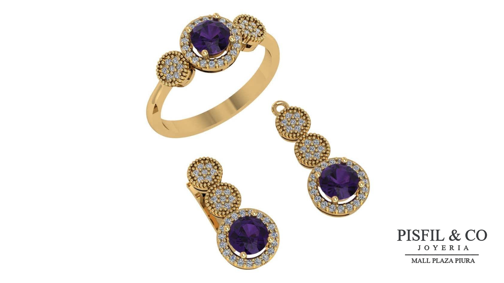 Diseño: Es un estilo sofisticado que destaca por el contraste de colores y la repetición de formas circulares. Cada pieza se caracteriza por una amatista central de talla brillante (corte redondo) de un color violeta intenso.