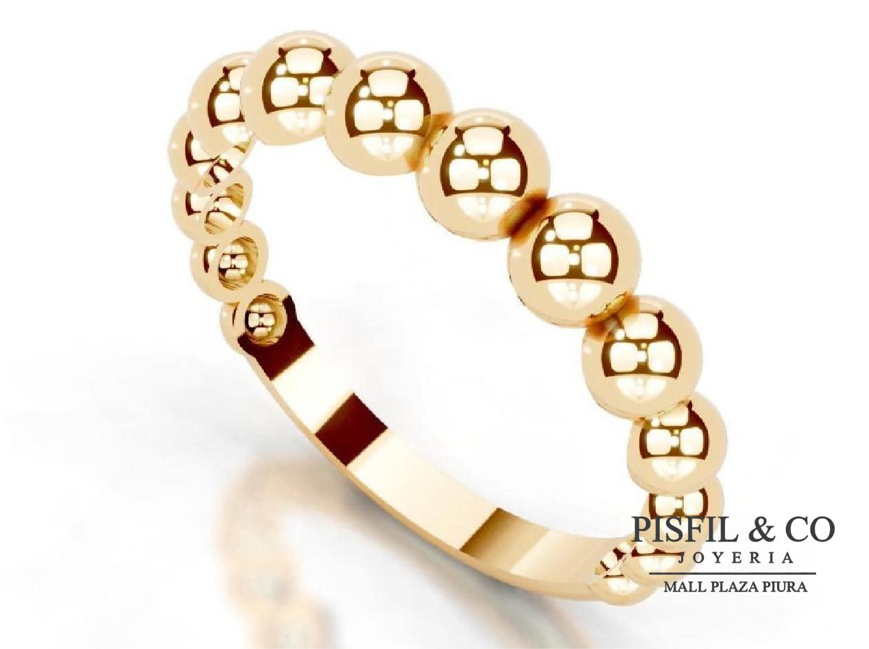 Descripción: Presenta una serie de esferas de oro perfectamente alineadas que cubren gran parte del aro. Estas cuentas disminuyen ligeramente su tamaño hacia la base de la banda para mayor comodidad.