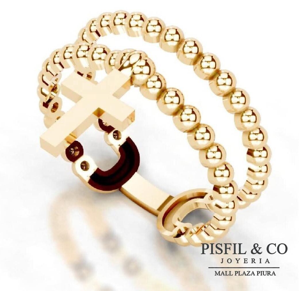 Descripción: Una pieza de profundo simbolismo que une la fe con el diseño actual. La banda está compuesta por dos hileras de esferas pulidas (beaded style) que sostienen una cruz latina de líneas rectas y acabado espejo, creando un efecto de anillo doble en una sola pieza.