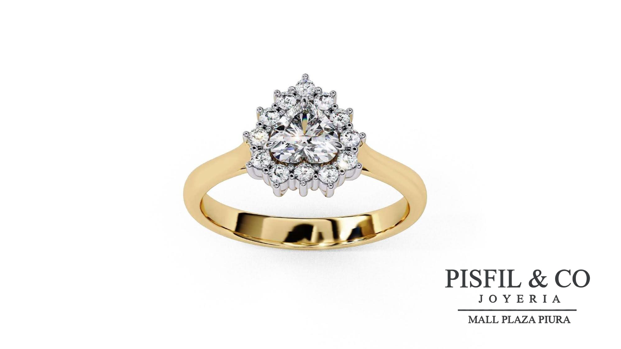 Diseño: Pieza romántica con un cristal swarovski central tallado en forma de corazón. Está enmarcado por un halo de cristales swarovski circulares engastados en garras de oro blanco para potenciar su blancura. El cuerpo del anillo es una banda de oro amarillo de ancho medio y acabado liso.