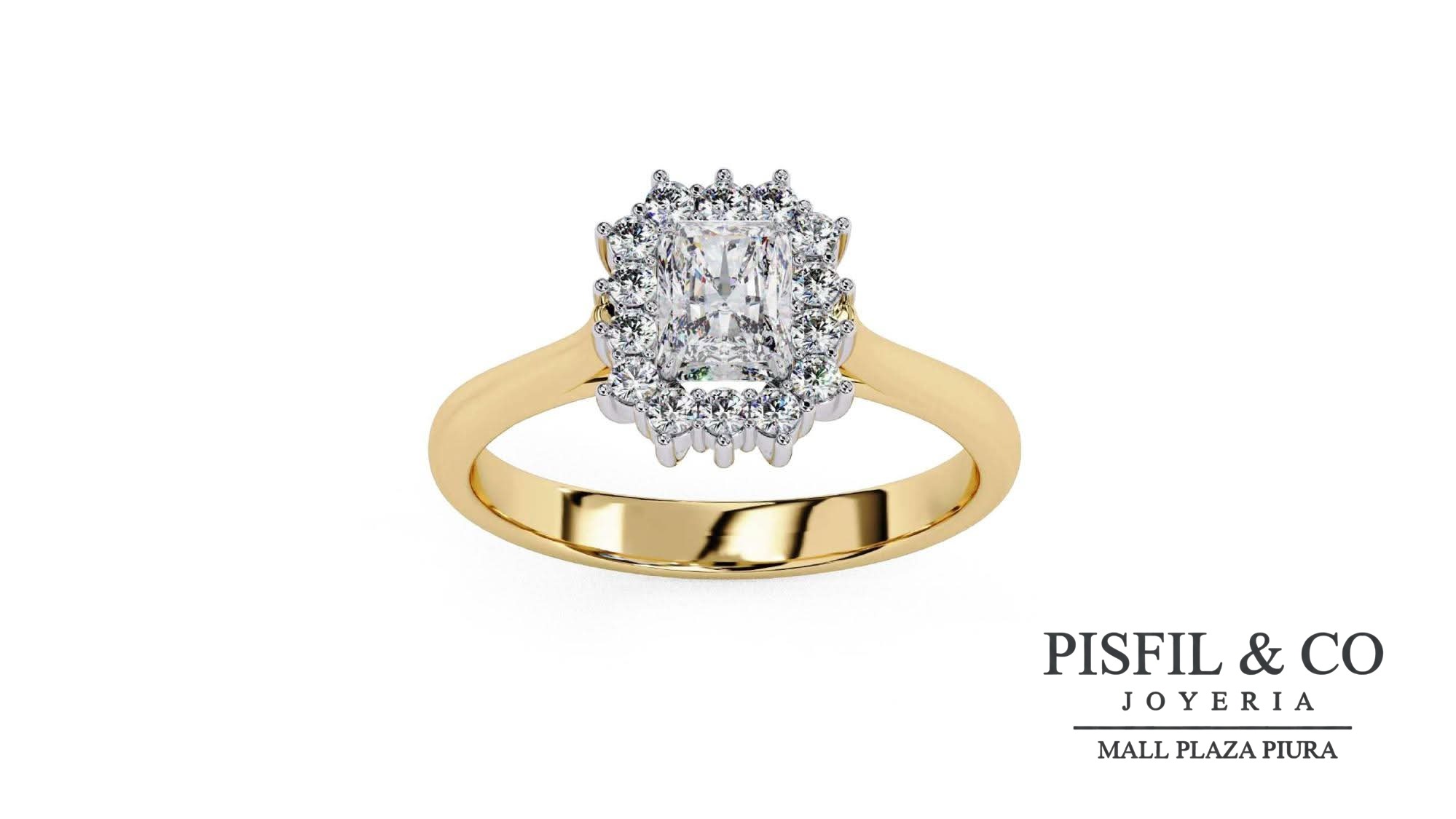 Diseño: Presenta un cristal swarovski central de talla rectangular (tipo esmeralda o radiant), enmarcado por un halo de cristales swarovski redondos. El montaje está elevado sobre un aro de oro amarillo.