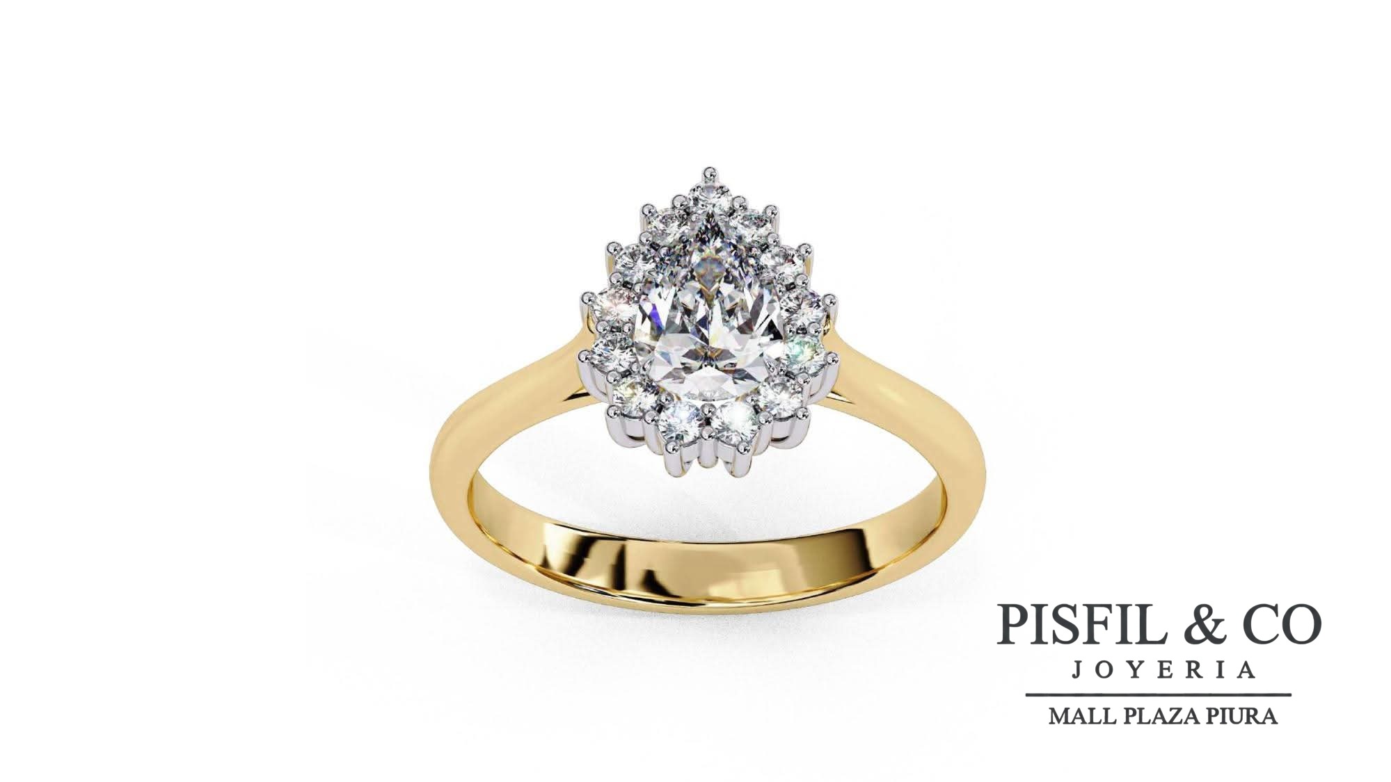 Diseño: Presenta un cristal swarovski central con talla pera (lágrima), enmarcado por un halo de cristales swarovski redondos que realza su silueta puntiaguda. El aro es de oro amarillo pulido.