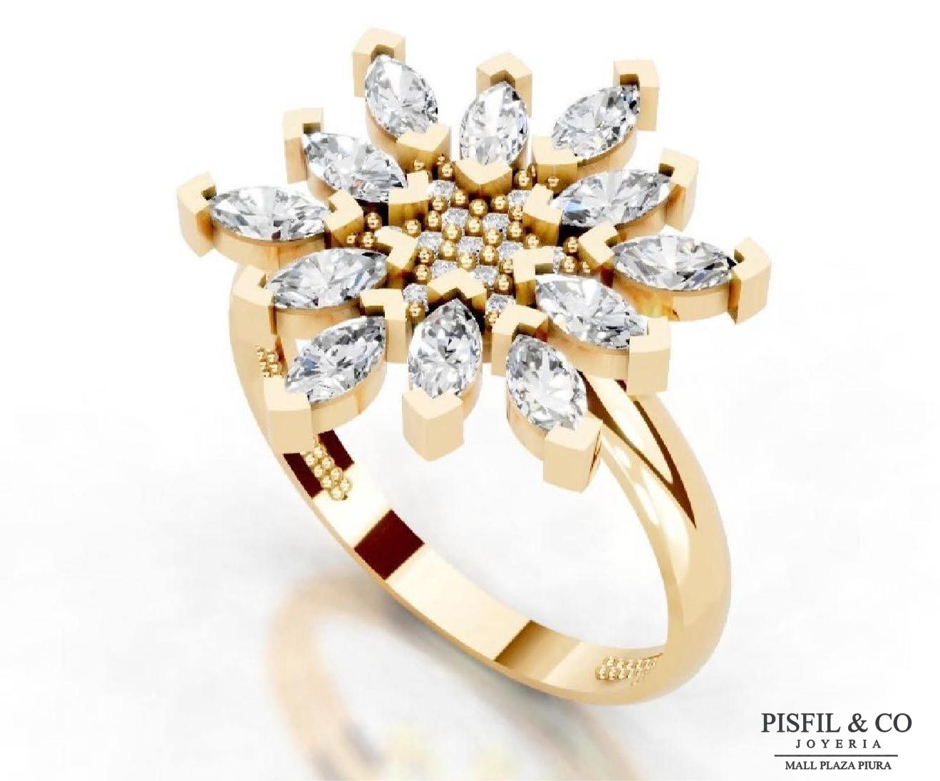 Diseño: Una pieza protagonista con diseño floral expansivo. Cuenta con un centro de microcristales swarovski rodeado por «pétalos» de cristales swarovski cada uno sostenido por garras robustas que enfatizan su silueta puntiaguda.