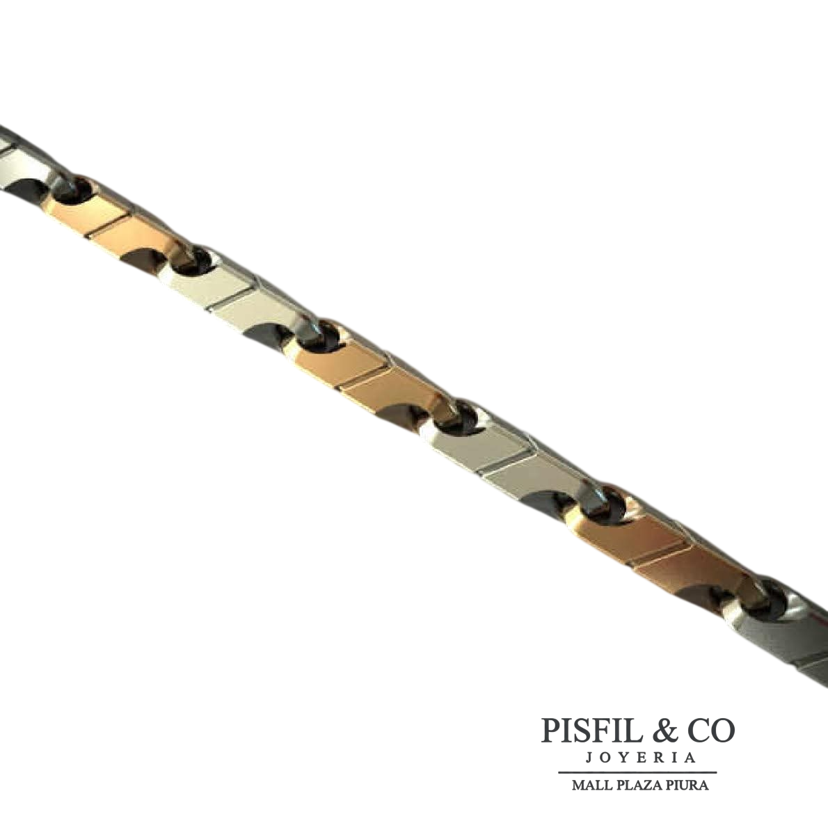 Diseño: Presenta un acabado bicolor, combinando tonos metálicos (como plata o acero) con secciones en tono dorado u oro rosa. Los eslabones suelen tener formas geométricas precisas, a veces descritos como eslabones de estilo «mecánico»