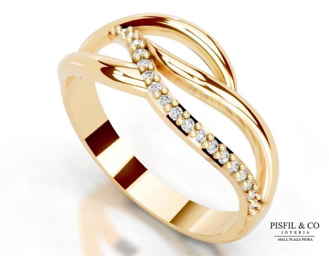La estructura se bifurca desde la base (caña) en tres hilos de oro amarillo 18K que recorren el dedo a diferentes alturas. Las bandas exteriores son asimétricas y fluidas