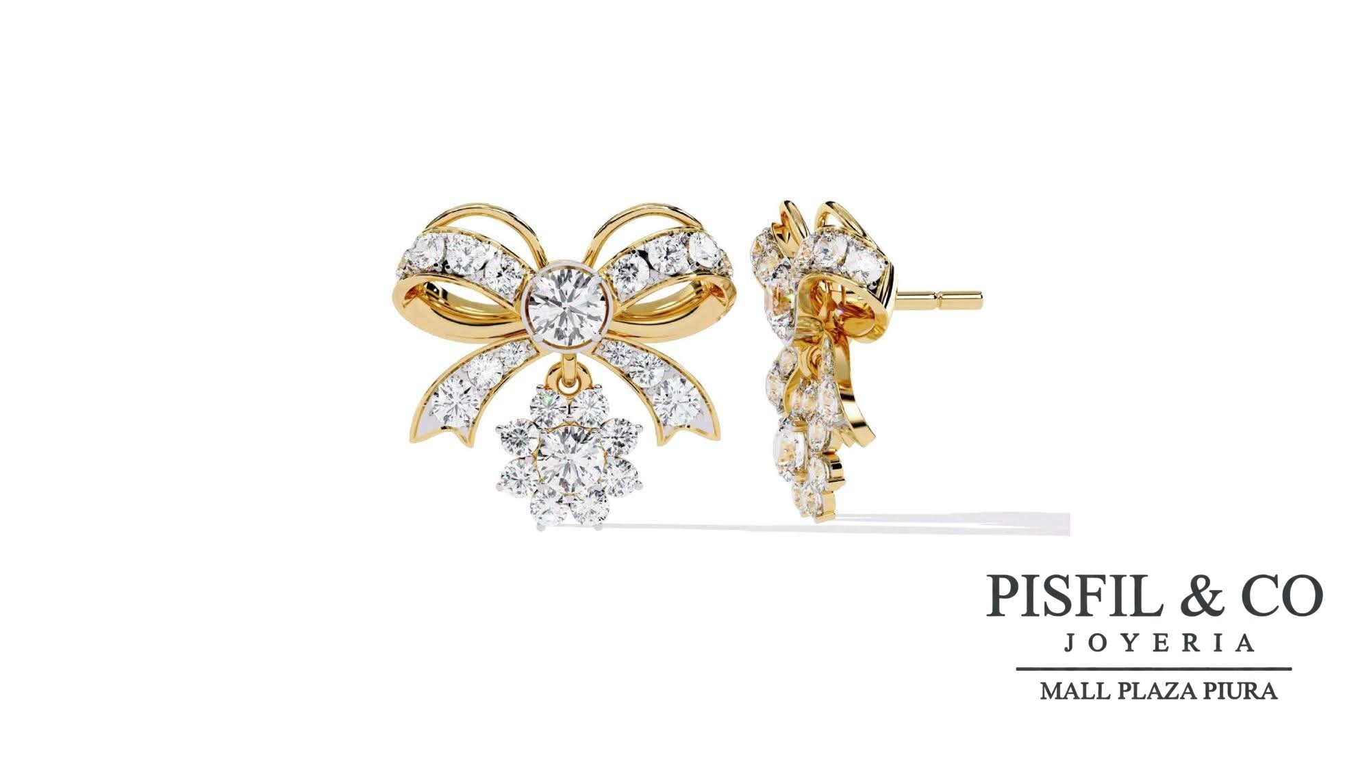 Diseño: Presenta un motivo de lazo o moño meticulosamente trabajado, del cual pende un cristal swarovski colgante en forma de copo de nieve. La estructura de lazo tiene líneas fluidas que imitan el movimiento de una cinta de seda.