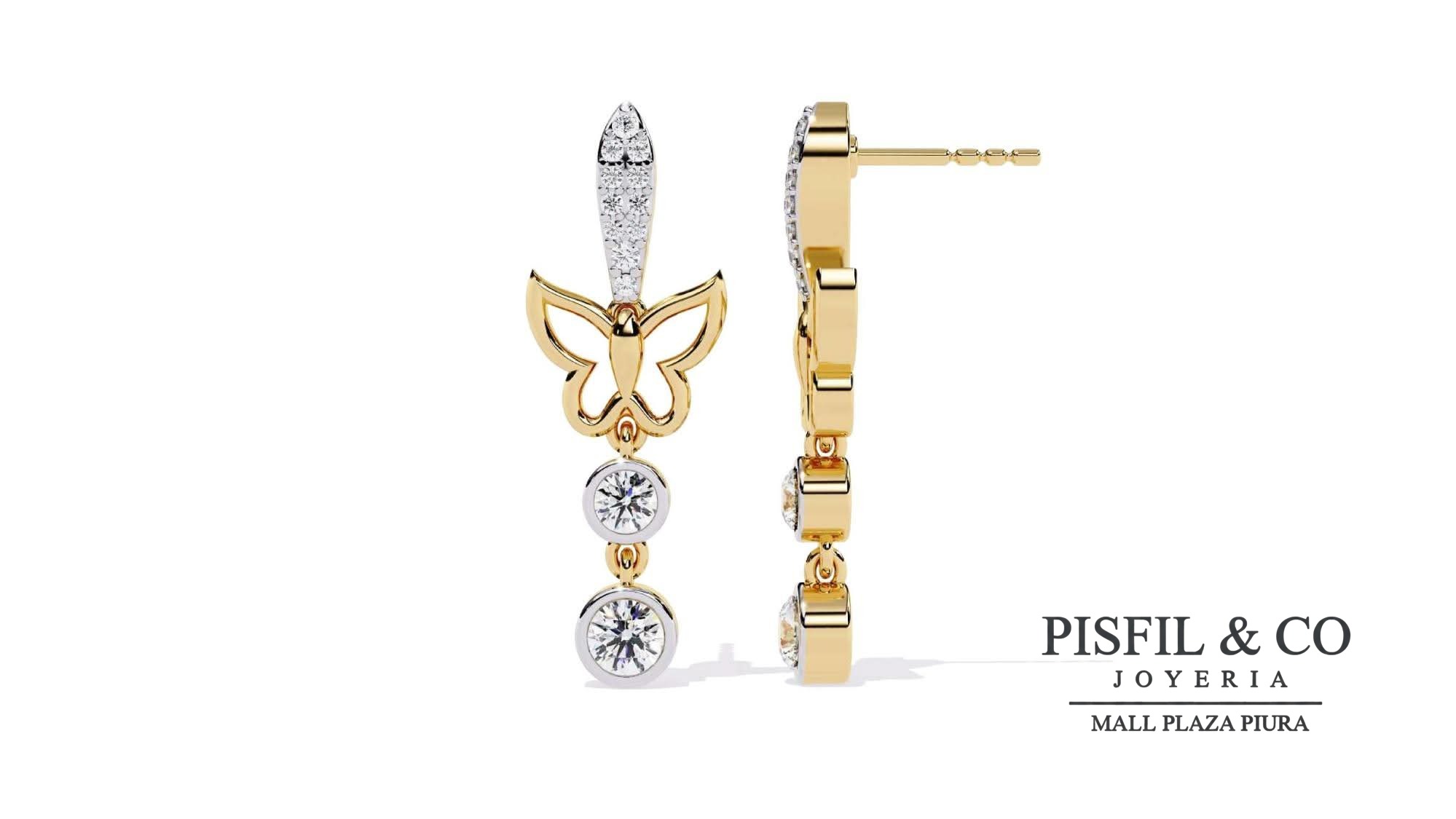 Diseño: Un elemento en forma de hoja o gota alargada, decorado con un engaste pavé de múltiples cristales swarovski pequeños que cubren toda su superficie frontal. Acompañado de una silueta de mariposa calada fabricada en oro amarillo sólido.