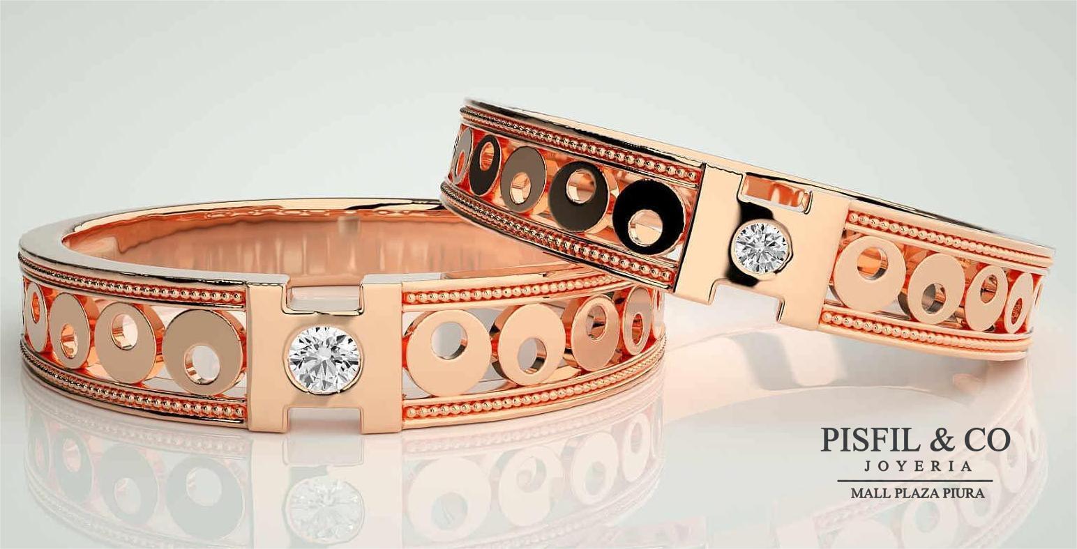Diseño: Aros de banda ancha con patrones circulares calados y bordes granulados tipo «milgrain».