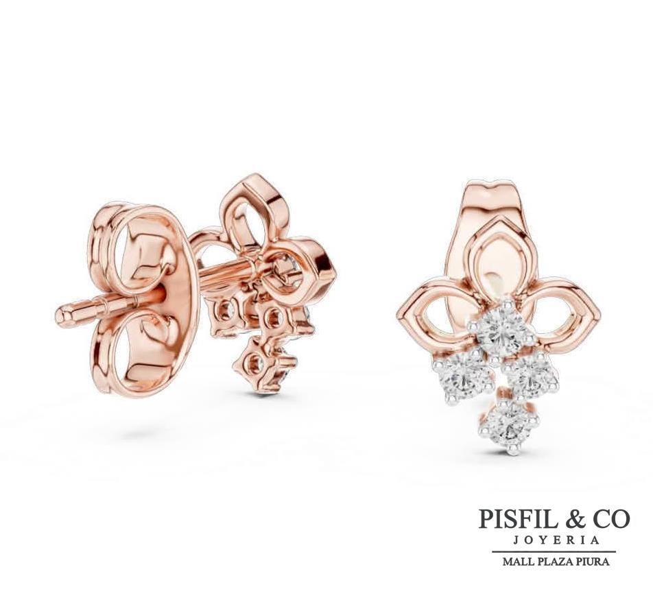 Diseño: Es un estilo elegante que combina elementos clásicos. Se caracteriza por una base calada en forma de pétalo o flor de lis en metal pulido, de la cual emergen cuatro cristales swarovski de talla brillante (corte redondo).