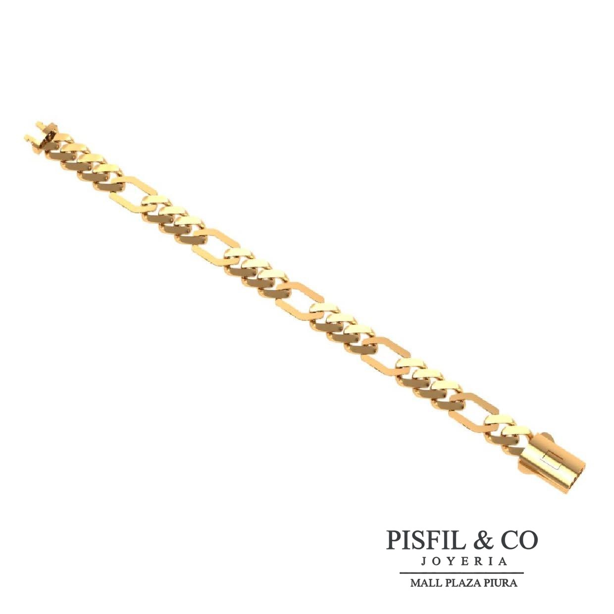 Diseño: Pulsera de diseño moderno con eslabones geométricos alargados combinados con detalles entrelazados. Elaborada en oro amarillo con acabado pulido, incorpora un broche cajon.