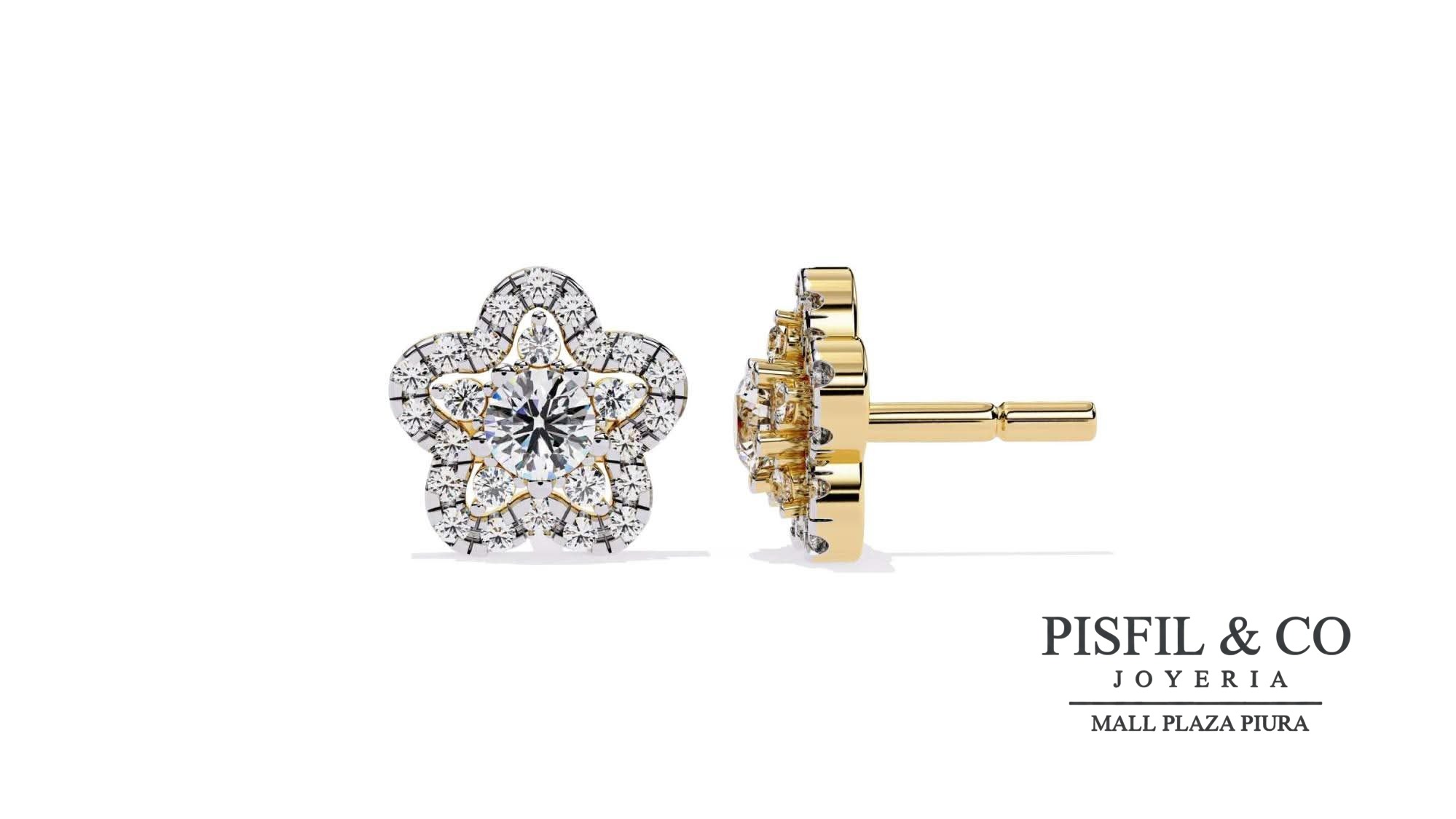 Diseño: Es un estilo sumamente brillante y de gran tamaño visual. Presenta un swarovski central de talla brillante (redondo), rodeado por dos niveles concéntricos de diamantes más pequeños que siguen la forma de cinco pétalos.