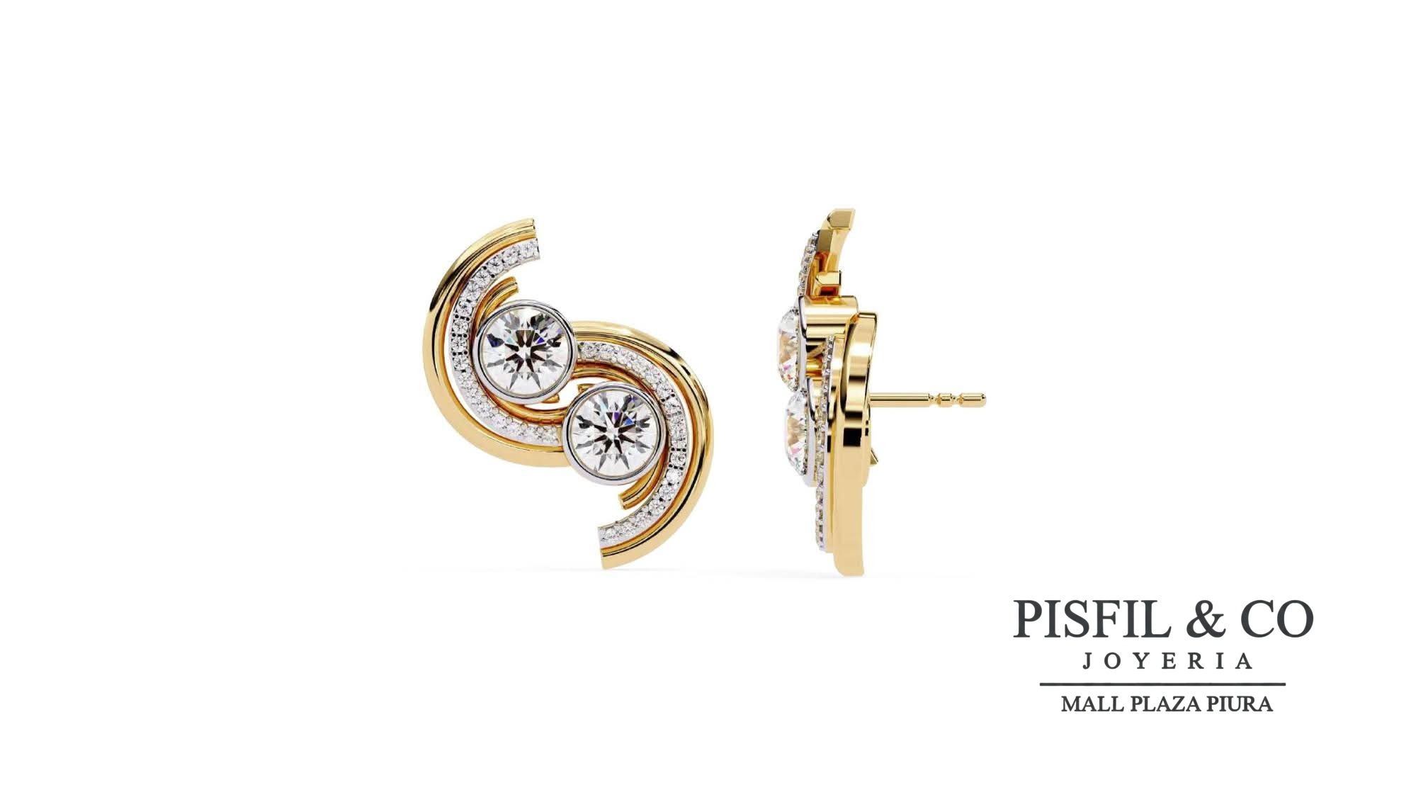 Diseño: Los pendientes presentan una silueta de doble espiral entrelazada que evoca el movimiento orbital. Cada arete exhibe dos cristales swarovski centrales de talla brillante redonda en un engaste biselado (bezel), que protege la gema a la vez que resalta su contorno.